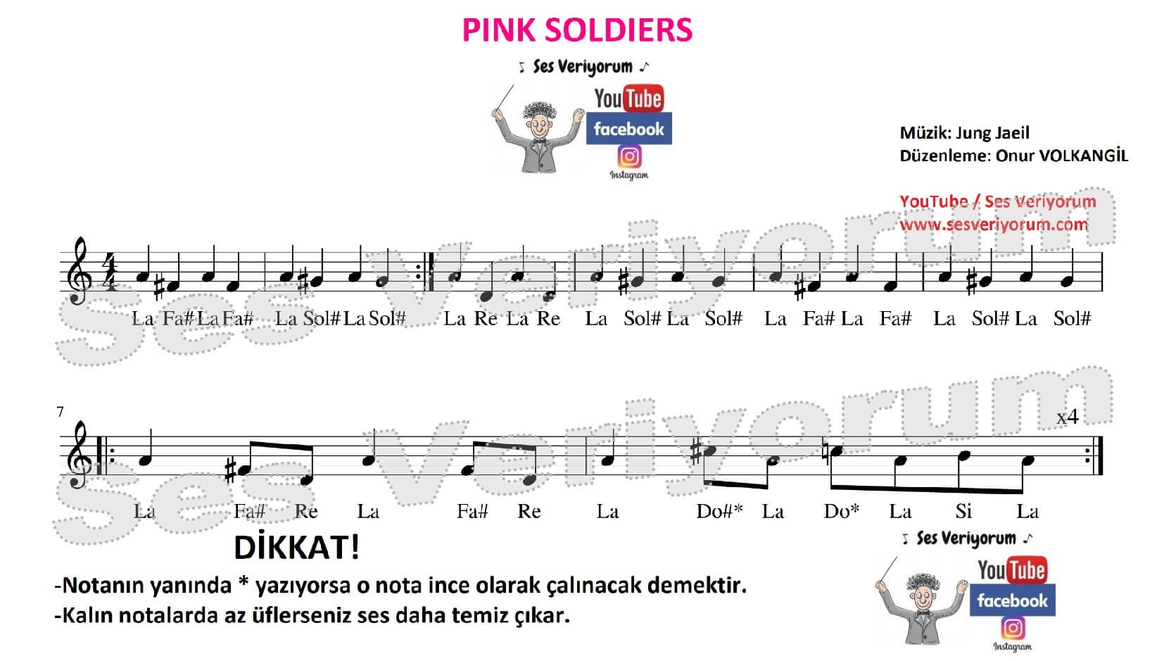 Herkese merhaba, Squid Game Pink Soldiers flüt notaları sayfasına hoş geldiniz. Daha sonra melodika notaları ile yayınladığım Pink Soldiers şarkısını, YouTube kanalımda gelen yorumlardaki istekleri dikkate alarak bu sayfamda da flüt notaları ile yayınlamaya karar verdim. Pink Soldiers şarkısı aslında flüt notaları ile çalabilmek için o kadar da uygun değil. Çünkü şarkıda oldukça fazla diyez içeren flüt notası var. Ancak Ses Veriyorum olarak sizlerin de çalabilmesi için çalınması en kolay şekilde flüt notalarını düzenledim ve yayınladım. Eğer Pink Soldiers flüt notalarında çalmayı bilmediğiniz bir nota varsa bu sayfadan o notayı bulup nasıl çalındığını kolaylıkla öğrenebilirsiniz. Aşağıdaki yorum kısmından bana hemen ulaşabilir ve sorularınızı sorabilirsiniz. Herkese iyi çalışmalar...