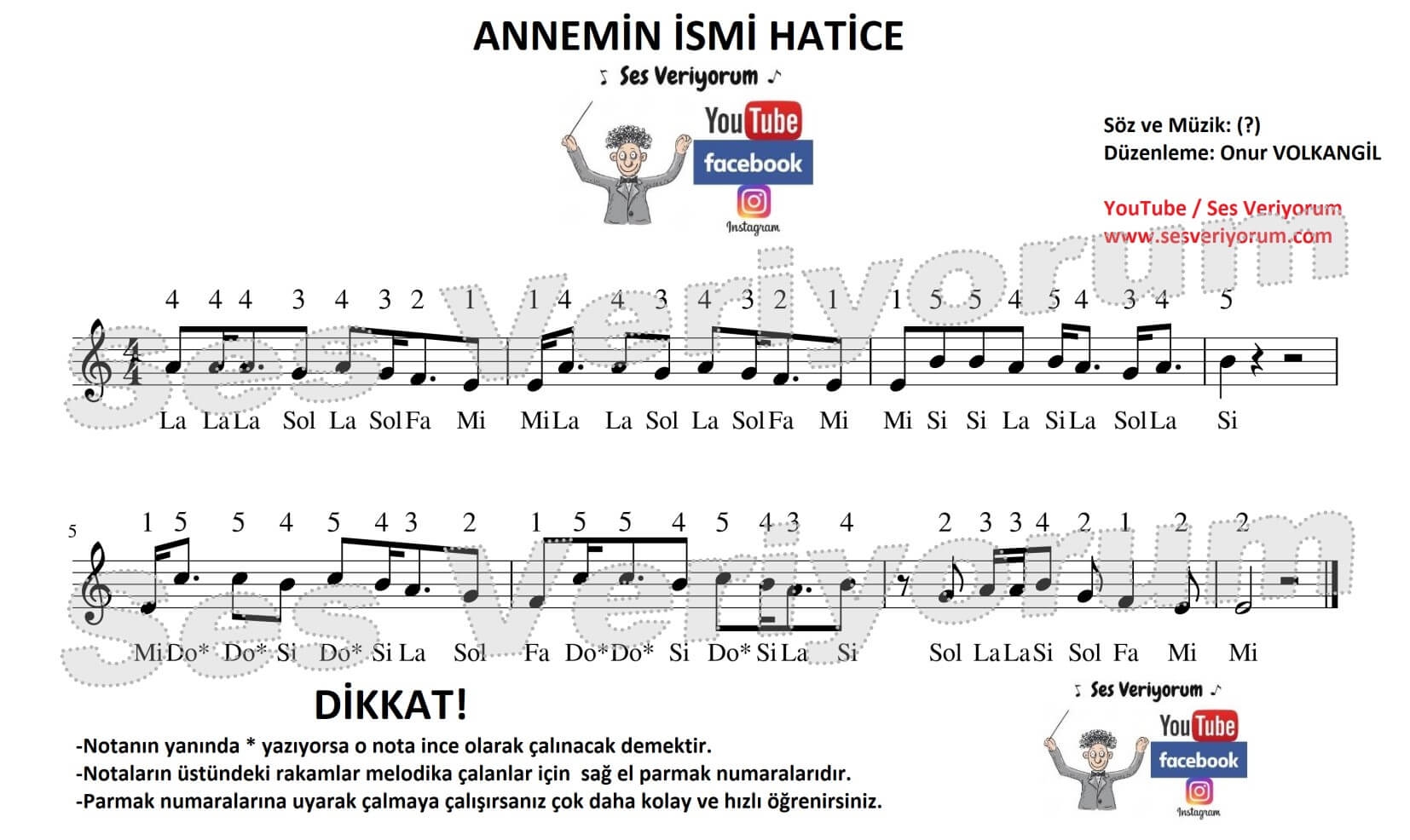 Herkese merhaba, ANNEMİN İSMİ HATİCE melodika notaları sayfasına hoş geldiniz. Bu sayfamda sizlere Rafadan Tayfa çizgi film karakterlerinin söylediği Annemin İsmi Hatice şarkısını en doğru melodika notaları eşliğinde öğretmek istedim. Eğer melodikaya yeni başladıysanız ve Annemin İsmi Hatice şarkısını melodikanız ile çalmak istiyorsanız muhtemelen biraz zorlancaksınız. Çünkü bu şarkı melodika için orta seviye denebilecek bir şarkı. Melodika çalmakla ilgili aklınıza takılan tüm soruların cevaplarını bu sayfada bulabilirsiniz. aşağıdaki YORUM kısmından bana hemen ulaşarak diğer sorularınızı da sorabilirsiniz. Herkese iyi çalışmalar...
