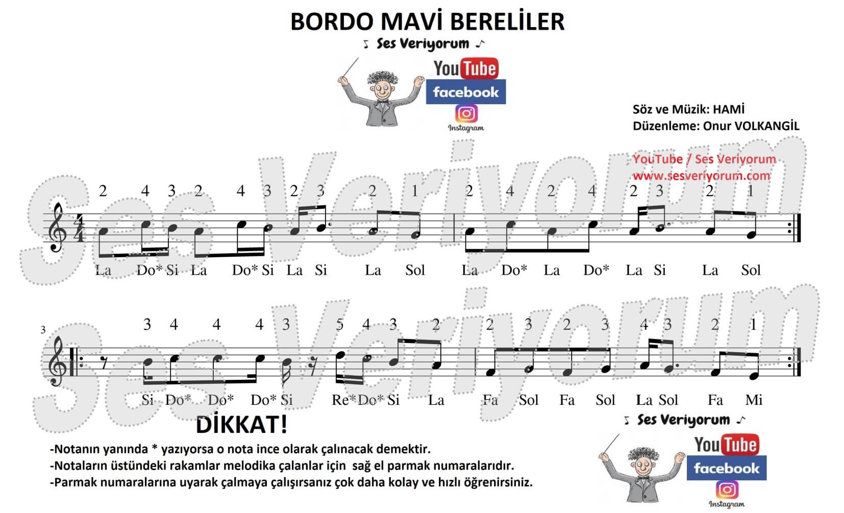 Herkese merhaba, Bordo Mavi Bereliler melodika notaları sayfasına hoş geldiniz. Bu sayfamda çok sevildiğini düşündüğüm ve söz müziği HAMİ'ye ait olan Bordo Mavi Bereliler şarkısını kendi hazırladığım kolay melodika notaları ile sizlere de öğretmeye çalıştım. Bordo Mavi Bereliler melodika notalarını kısa sürede öğrenmeniz melodikayı hatasız bir şekilde çalışmanıza bağlı. Melodikayı doğru bir şekilde çalışmayı bilmiyorsanız bu sayfayı ziyaret ederek melodika çalınışıyla ilgili tüm detaylara ulaşabilirsiniz. Yine de kafanıza takılan sorular olursa aşağıdaki yorum kısmından bana ulaşabilirsiniz, sizlere yardımcı olmaktan mutluluk duyarım, herkese iyi çalışmalar...