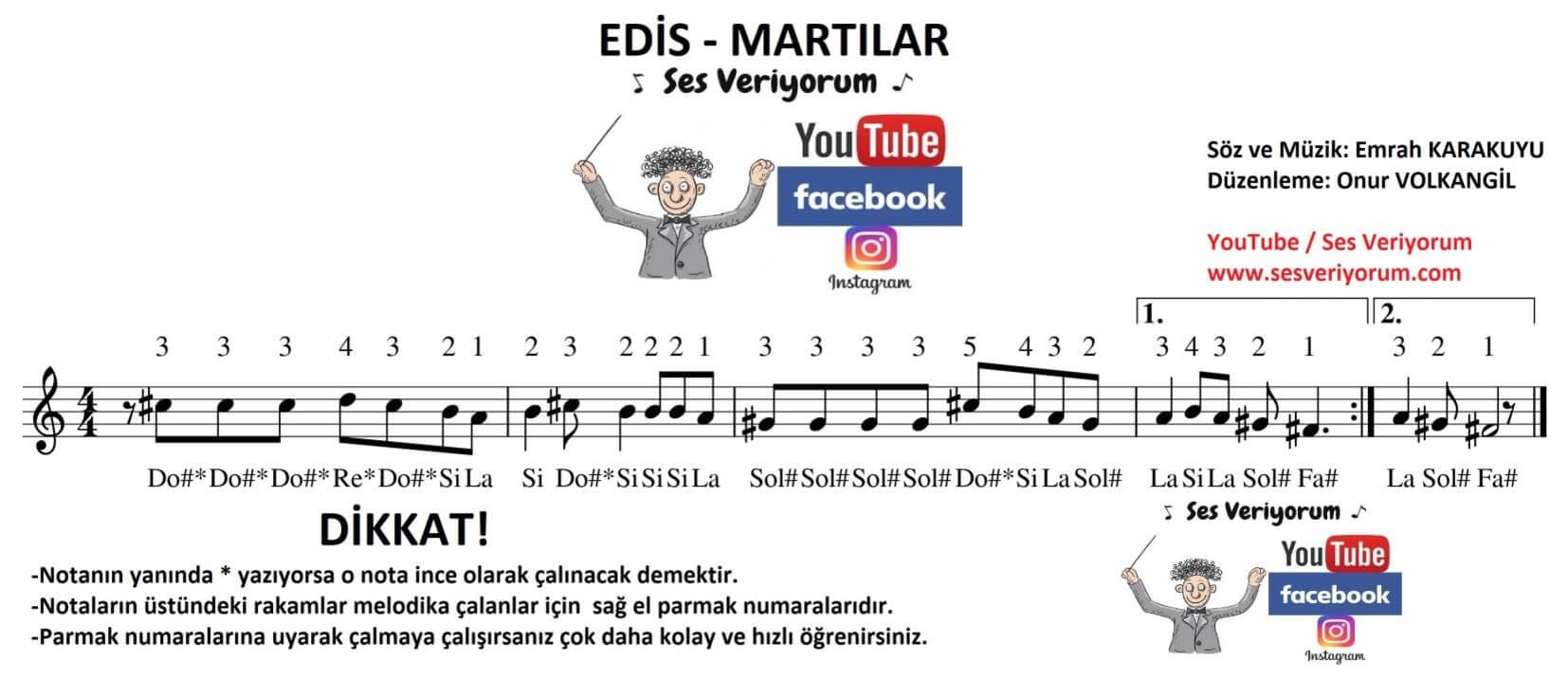 Herkese selamlar, Edis Martılar melodika notaları sayfasına hoş geldiniz. Bu sayfamda çok sevdiğinizi düşündüğüm Martılar şarkısını, siz değerli takipçilerime en doğru melodika notaları ile öğretmek istedim. Martılar şarkısını melodika ile çalmak şarkıyı iyi bilen birisi için kesinlikle çok kolay. Lütfen melodika notalarındaki diyezli notalar sizleri hemen korkutmasın. Diyez ve bemol alan notaları nasıl çalmanız gerektiğini YouTube kanalımda bana yorum yazarak sorabilirsiniz. Aşağıdaki yorum kısmından bana sorularınızı hemen sorabilirsiniz. Herkese iyi çalışmalar diliyorum...