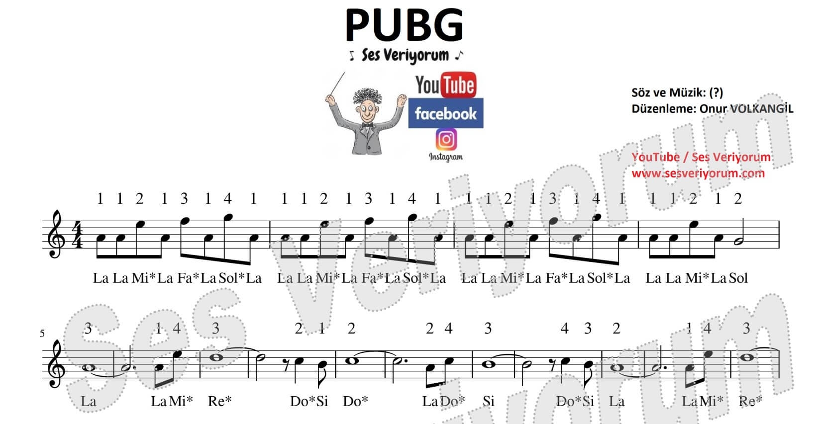 Ses Veriyorum'dan herkese merhaba, PUBG melodika notaları sayfasına hoş geldiniz. Bu sayfada dünyayı kasıp kavuran PUBG oyununun müziğini, kendi hazırladığım kolay melodika notaları ile sizlere de öğretmeye çalıştım. Pubg melodika notalarını çalabilmek için dikkat etmeniz gereken iki konu var. Birincisi birbirine bağlanmış olan notalar. Bu notaları hiç ara vermeden çalmanız gerektiği için öncesinde çok güçlü bir nefes almalısınız. İkincisi de parmak numaraları. Parmak numaralarına dikkat ederek çalışırsanız çok daha kolay ezberler ve çalarsınız. Zor bir melodika notası kesinlikle değil, kısa zamanda öğreneceğinizi düşünüyorum. Ayrıca "Melodika Nasıl Çalınır?" ile ilgili detaylıca bilgi sahibi olmak isterseniz bu sayfayı mutlaka ziyaret etmenizi tavsiye ederim. Aşağıdaki yorum kısmından bana tüm sorularınızı sorabilirsiniz. Herkese iyi çalışmalar...