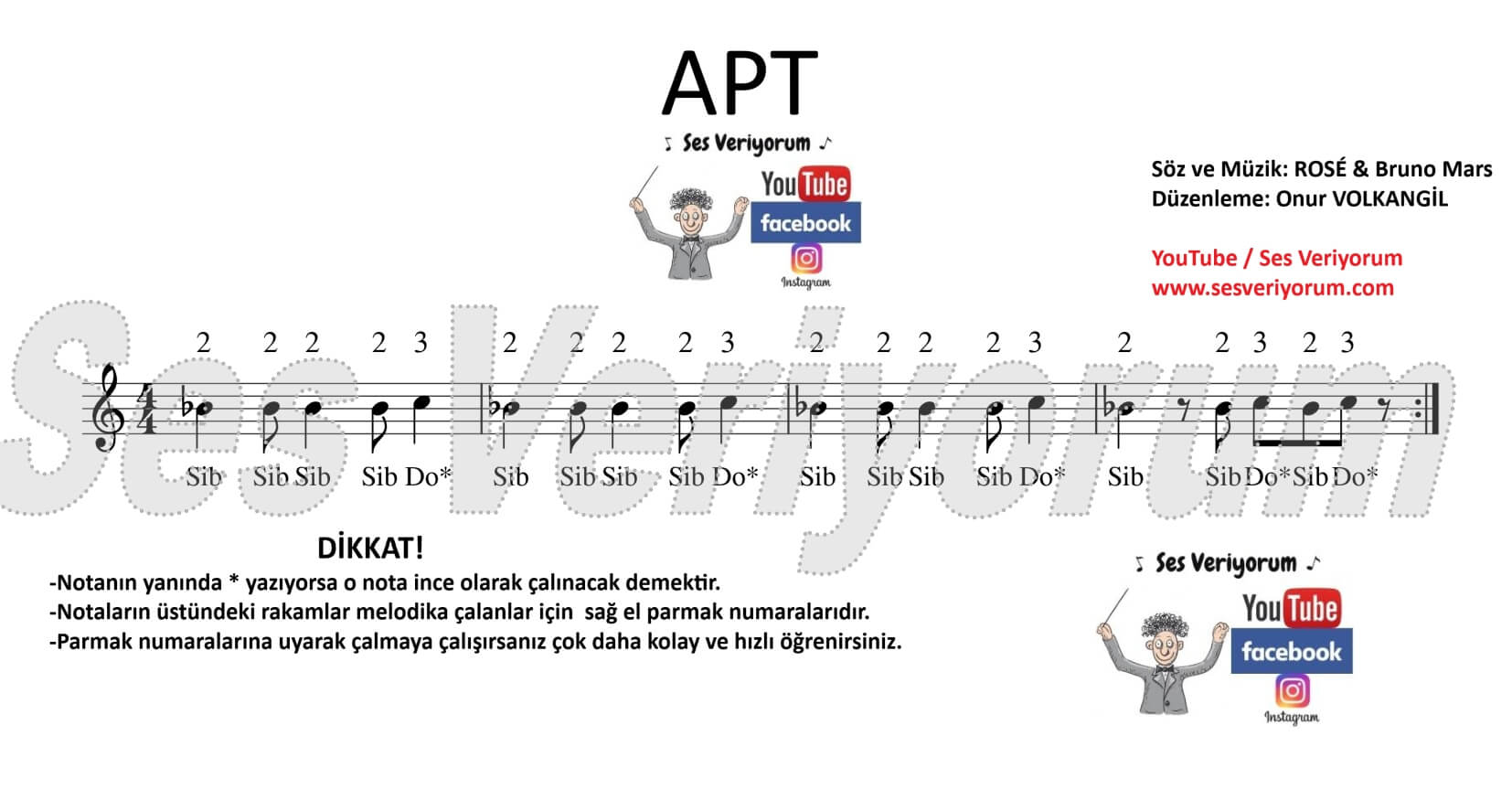 Herkese merhaba, APT melodika notaları sayfasına hoş geldiniz. Aslında çok daha önceden çalıp paylaşmam gereken bir şarkı olan APT şarkısının melodika notalarını özür dileyerek ancak şimdi yayınlayabiliyorum. Sadece iki notadan oluşan bu kolay melodika şarkısını hemen çalacaksınız bence. Çalıp çalamadığınızı çok merak ediyorum ve sizleri yorumlara bekliyorum. 👇 Aşağıdaki YORUM kısmından bana hemen ulaşarak tüm sorularınızı sorabilirsiniz. Hepinize iyi çalışmalar...